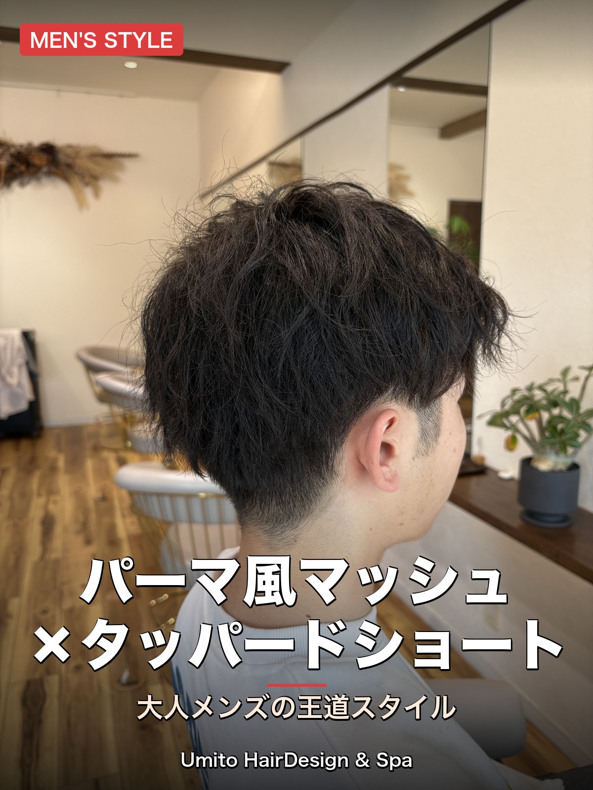 襟足はタッパードでナチュラルに刈り上げ、後頭部の立体感とのバランスがポイントです。